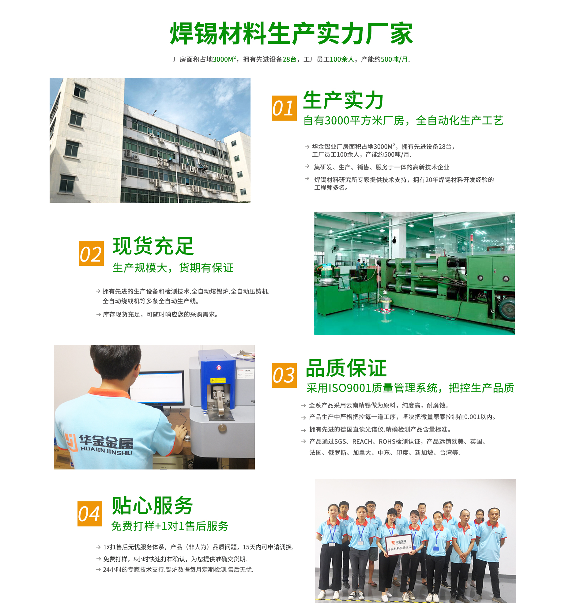 華金錫業(yè)有限公司一家資深的專業(yè)焊錫制品生產(chǎn)廠家,多年專注焊錫制品生產(chǎn)加工。產(chǎn)品有無(wú)鉛錫絲.無(wú)鉛錫條.錫板.錫膏.錫珠等.公司憑借多年的經(jīng)驗(yàn)和不斷的科技創(chuàng)新.生產(chǎn)的產(chǎn)品各項(xiàng)技術(shù)性能均達(dá)到國(guó)家標(biāo)準(zhǔn).歐盟標(biāo)準(zhǔn)。并獲得眾多使用廠家的肯定.為適應(yīng)環(huán)保要求.本公司2003年巨資投入生產(chǎn)無(wú)鉛焊錫,多年來(lái)連續(xù)通過(guò)SGS環(huán)保認(rèn)證.產(chǎn)品規(guī)格齊全,使用性能極佳。客戶群體遍布全國(guó)各地及國(guó)外用戶。華金錫業(yè)焊錫制品是選用一線品牌作為原材料,采用選進(jìn)的配方,精工制作各種規(guī)格不同的型號(hào),再采用全自動(dòng)流水線作業(yè)擠拉成各種符合要求的焊錫絲和焊錫條。華金牌焊錫制品以其一流的品質(zhì),真誠(chéng)的服務(wù),產(chǎn)品銷(xiāo)往全國(guó)各地,深受廣大用戶的高度贊揚(yáng)。